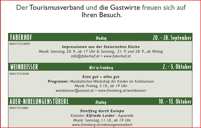 Für das Kabarett reife Publikum, darunter der Passauer Stahlhändler Otto Bogner, Ballettschuleinhaberin Traudi Hansel mit Vater Helmut, die Nilbelungenstüberlwirte Ludwig und Barbara Auer, Gemeindevorstand Erwin Ortanderl, Tischler Bezirksobermeister Franz Lang mit Gattin Sylvia, Raiffeisenbank-Geschäftsleiter Johann Demmelbauer-Ebner, Holzhändlerin Brigitte Pretzl und die Hausherren, die Weinbeißerwirte Heinz und Simone Diebetsberger galt es den ganzen Abend über die Lachmuskeln zu beanspruchen.