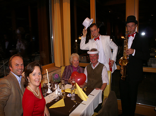 Franciskus & Pedro- die „Donaukavaliere“ waren kürzlich zu Besuch am Dreiflüsseeck hoch über Passau im Panoramarestaurant von Gerhard und Beate Blaas in Hinding bei Freinberg. Die beiden professionellen Event-Schauspieler aus Hallein bereicherten den herbstlichen Abend mit besonderem Charme. Pedro aus der Musiker-& Clown-Ecke stammend, Franciskus als Spezialist der hohen Künste wie Commedia dell’ Arte und Pantomime bildeten im Innviertel ein optimales Duo. Das dankbare Publikum, darunter das Raumaustatterehepaar Hans und Anita Auinger aus Taufkirchen an der Pram, Reiterhofchefin Pauline Madl, Kapsreiter-Servicemann Manfred Pillinger, Polizei-Bezirksinspektor Karl Hattinger, Ingrid Schwarz, Ressortleiterin „Bayern-Privat“ der Sparkasse Oberösterreich, Förster Gerhard Bernauer sowie Fritz und Anita Bauhuber von der Rehaklinik Passau, war hingerissen von den heiteren Klängen aus verschiedensten Instrumenten, der Mimik und den Zauberkunststücken vom laufenden Band. Die illustere Gästeschar wurde mit einer kräftigen Portion Humor bedacht. Übrigens, demnächst öffnet Dubai seine Pforten für dieses neuartige wie erfolgreiche Comedy-Duo, das bisher überwiegend in Wien, Salzburg und Spanien auf der Bühne zu erleben war.
