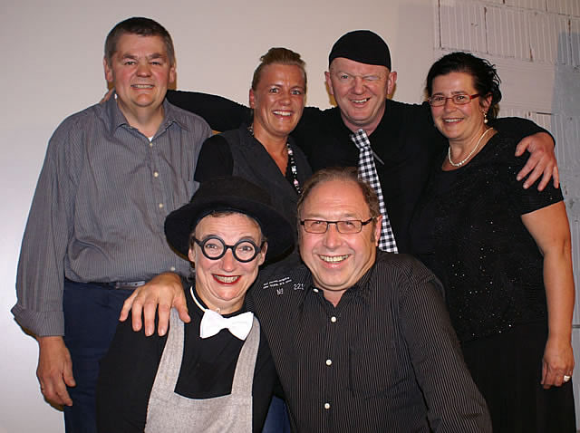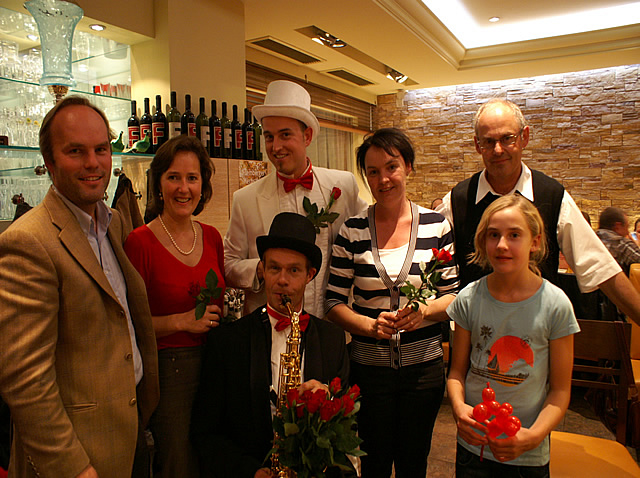 Internationales Entertainment im Innviertel. Von links: Hans und Anita Auinger, „Franciskus & Pedro“, der mit Blumen im Saxophon, Beate und Gerhard Blaas sowie Tochter Sarah.